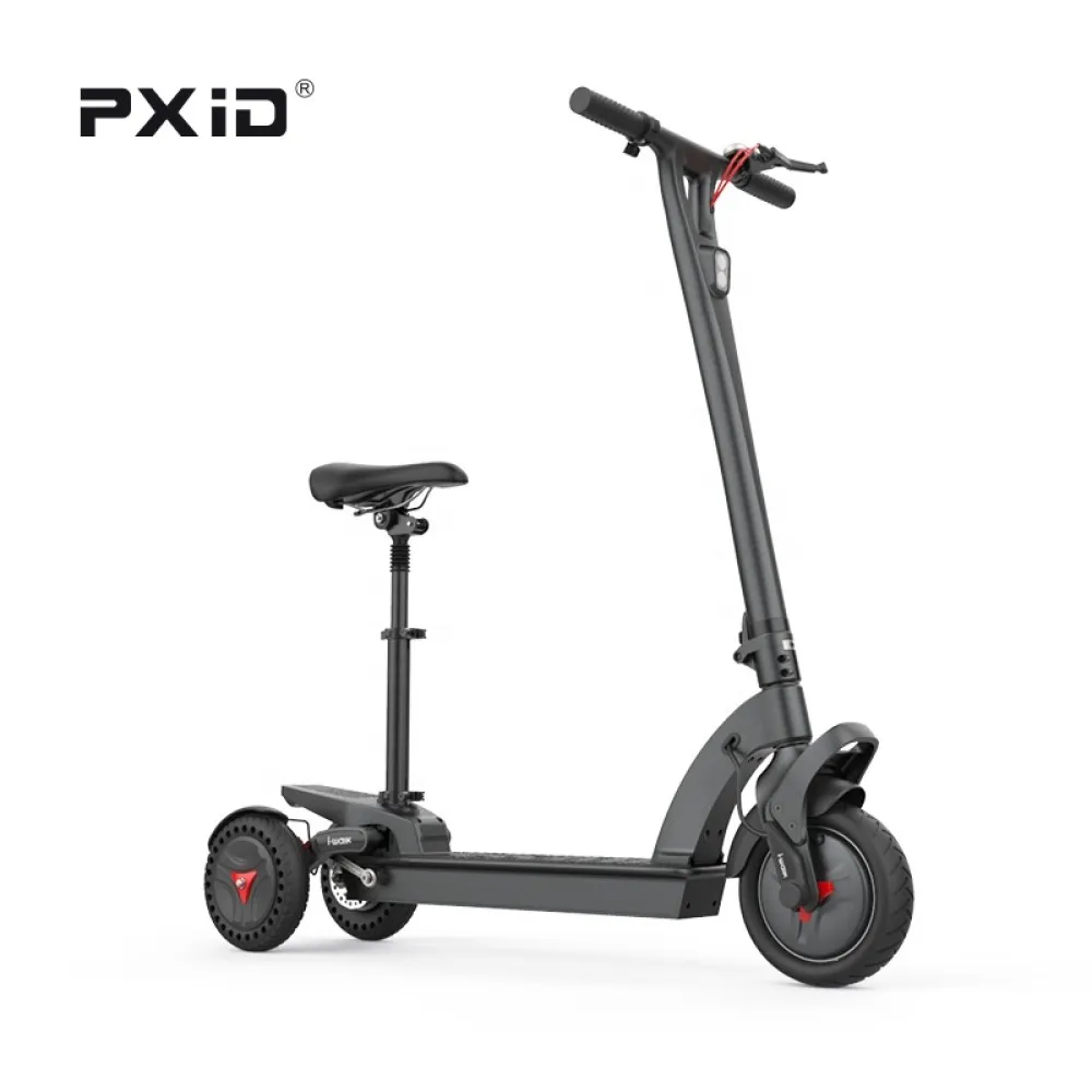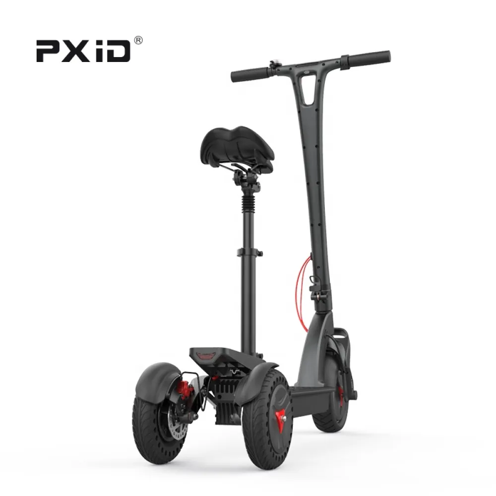 Трёхколёсный электросамокат с сиденьем PXID Е3 представлен в чёрном цвете. Минималистичный и аккуратный дизайн. Удобное регулируемое сиденье. Вес электросамоката: 18 кг с максимальной нагрузкой до 100 кг.