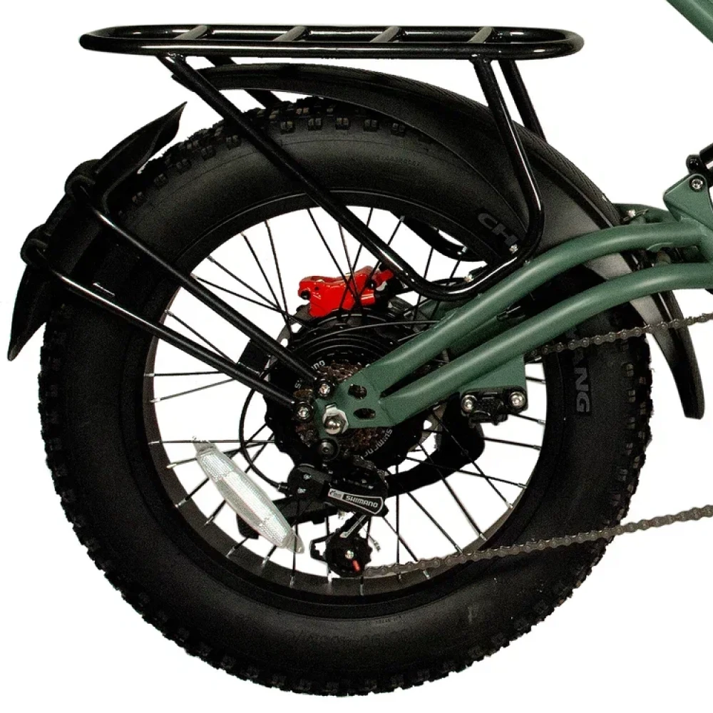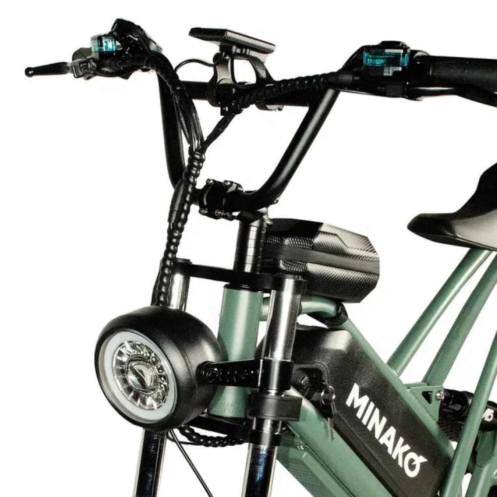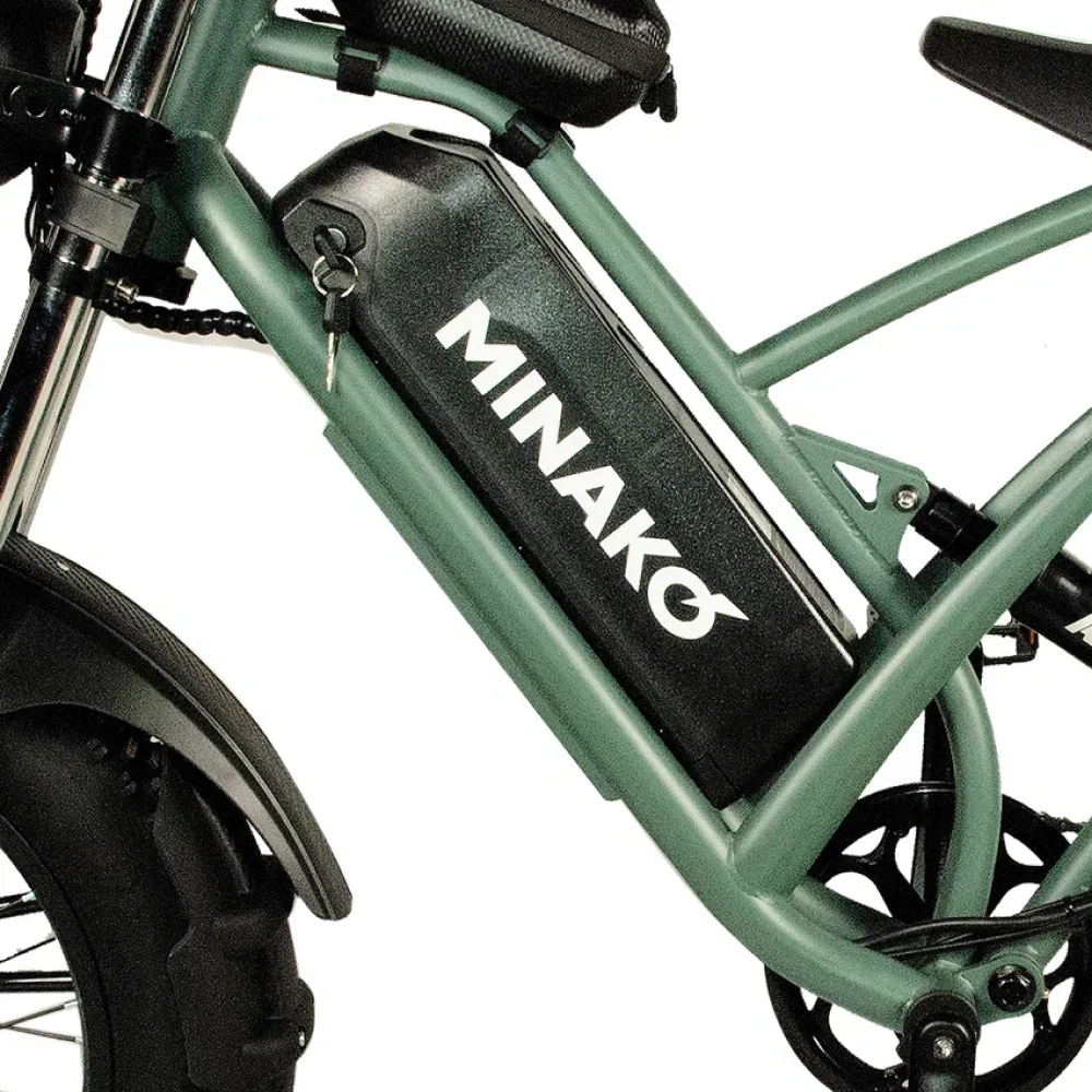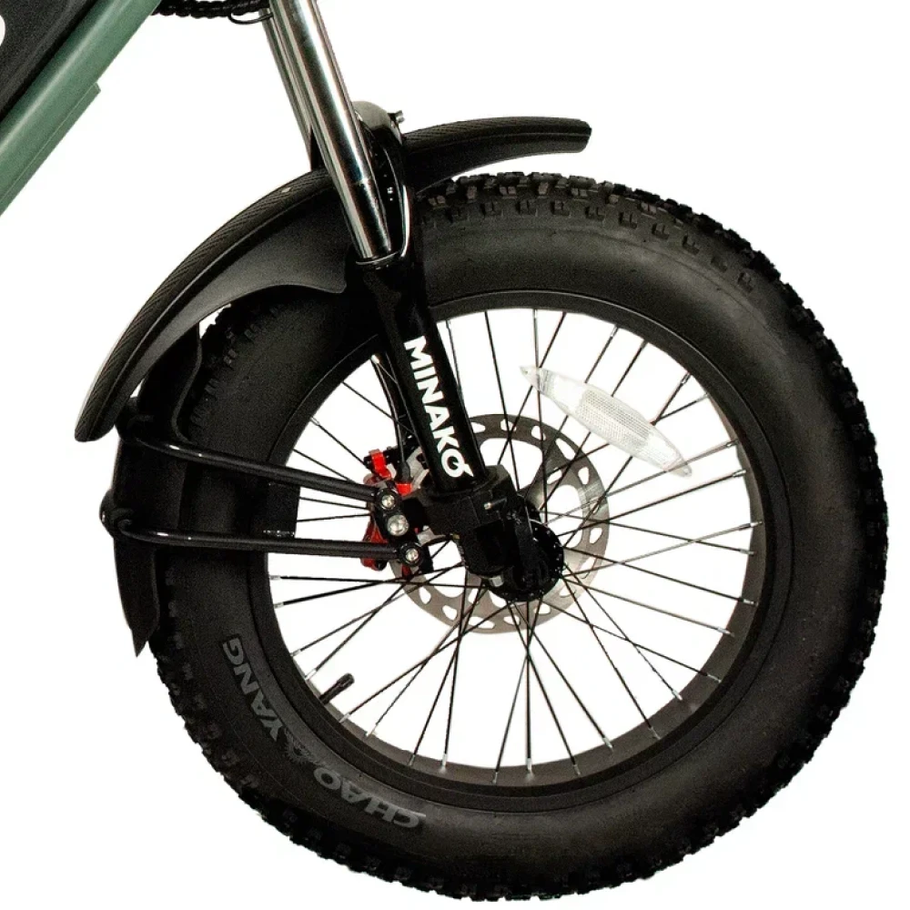 Электровелосипед Minako FOX (23Ah) в оливковом цвете - это сочетание мощности, стиля и удобства. С его 1000W двигателем, вы можете достичь максимальной скорости 55 км/ч, а 23 Ah аккумулятор обеспечивает пробег до 60 км на одном заряде. Уникальный дизайн, напоминающий питбайк, и мотоциклетная вилка подчеркивают его агрессивный вид. Большие внедорожные покрышки и гидравлические дисковые тормоза обеспечивают безопасность и уверенность на дороге. Багажник сзади, который можно использовать как место для пассажира, небольшая сумка спереди и стоп-сигнал делают его еще более удобным. Помимо переднего мотоциклетного амортизатора, есть еще и задний велосипедный амортизатор закрытого типа, обеспечивающий комфортную езду.